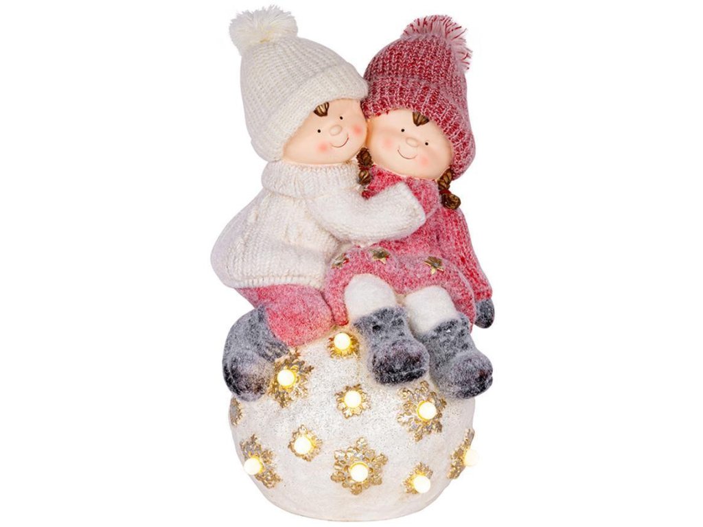 2. TRIEDA Dekorácia MagicHome Vianoce, Chlapec a dievčatko na guli, 9 LED, 3xAA, keramika, interiér, 32,50x30x50 cm