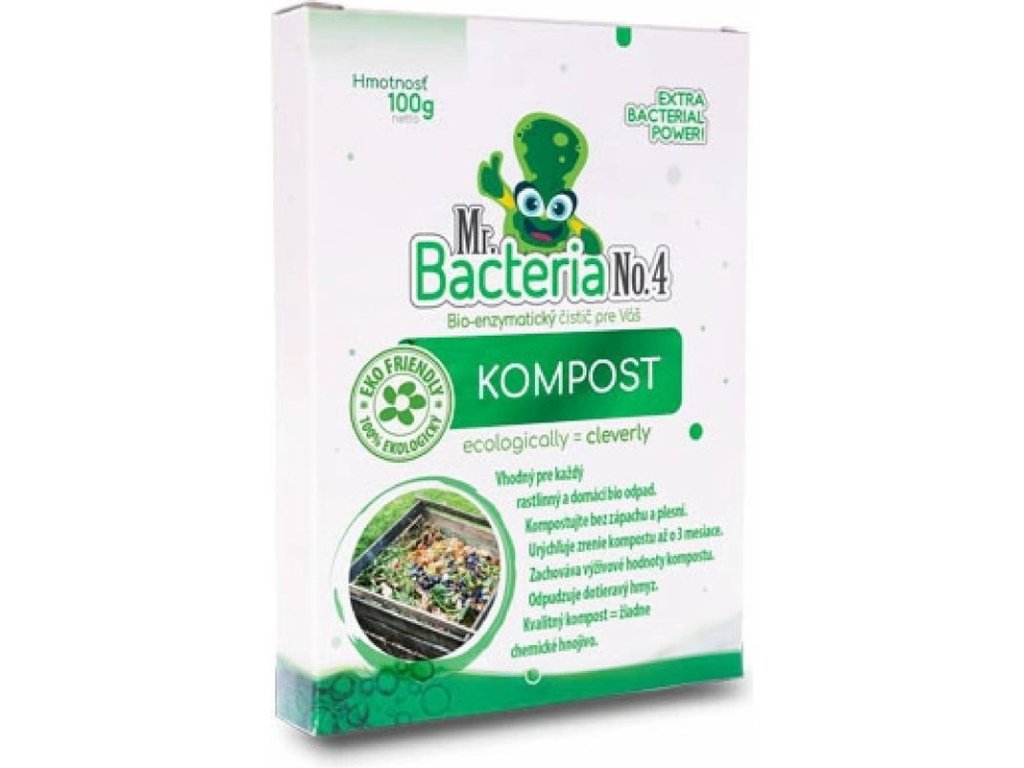 Úplne prírodný a ekologický bio-aktívny prípravok Mr. Bacteria No. 4 urýchľovač kompostu je určený na urýchlenie kompostovania. Obvyklá dĺžka kompostovanie je v rozsahu jedného roka. Prípravok Mr. Bacteria No. 4 vie značne urýchliť proces kompostovania záhradného odpadu a vybraného biologického odpadu z Vašej domácnosti. Mr. Bacteria No. 4 je zmes bakteriálnych kultúr zmiešaných s nespracovanými enzýmami, emulgátormi a živinami, špeciálne navrhnutá pre kompostovanie organických odpadov (odpad po sezónnom prerezávaní okrasných kríkov - štiepka, kôra, piliny, tráva, lístie, ovocie, zelenina, kvety, bioodpad z domácností a pod.). Výrobok funguje v dvoch fázach: urýchlenie naštartovania a výrazné skrátenie celého procesu kompostovania. Použitím prípravku Mr. Bacteria No. 4 dochádza k maximalizácii hnojív hodnôt kompostu. Výsledkom použitia prípravku Mr. Bacteria No. 4. je skrátenie dĺžky kompostovania.