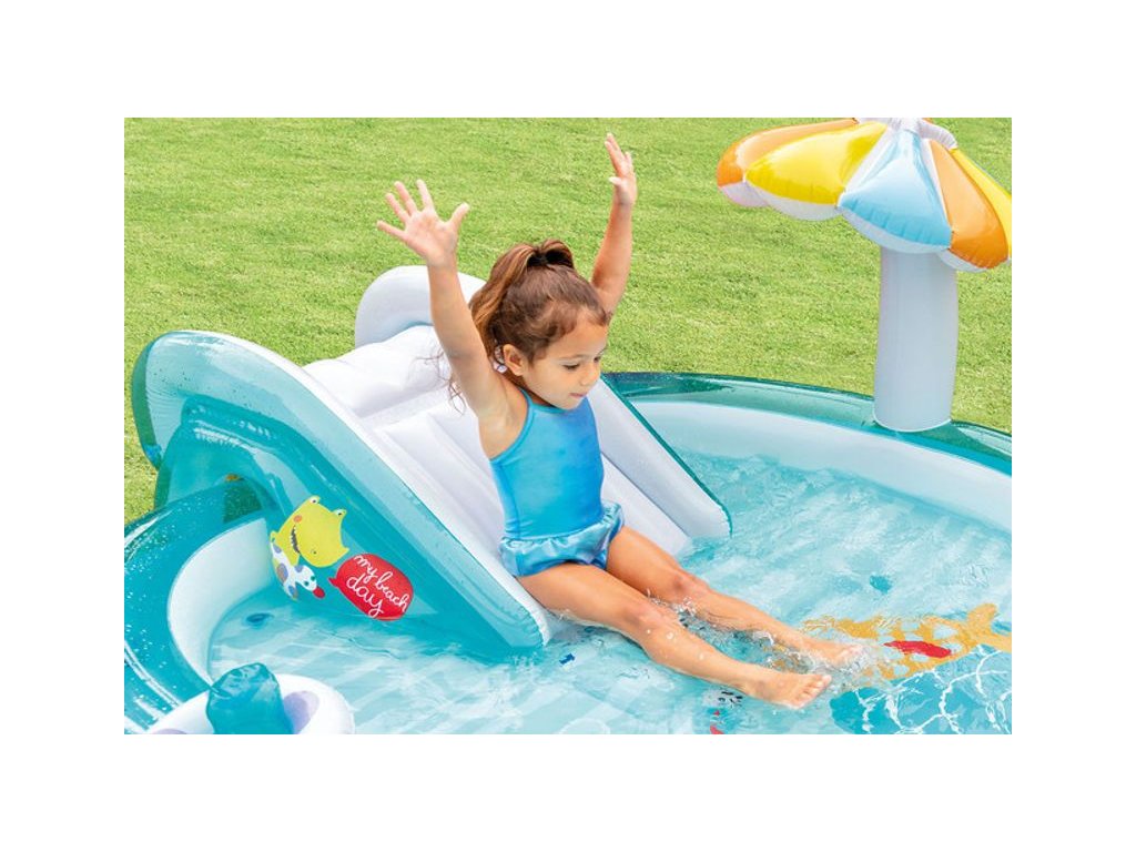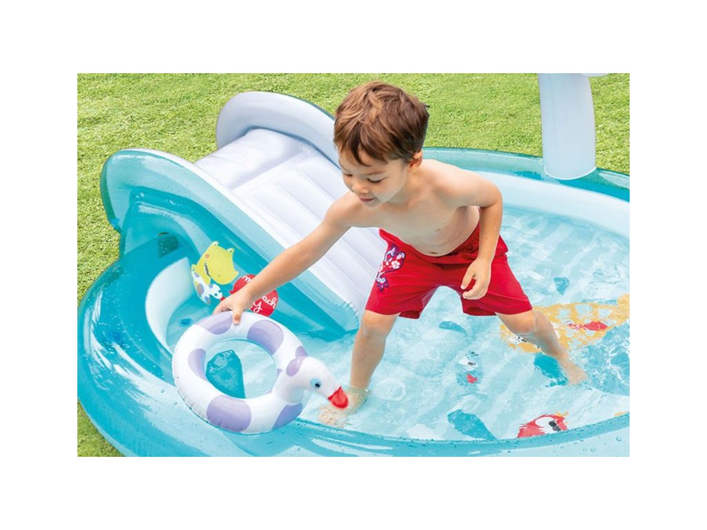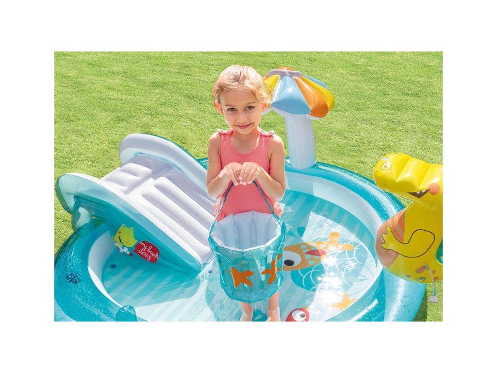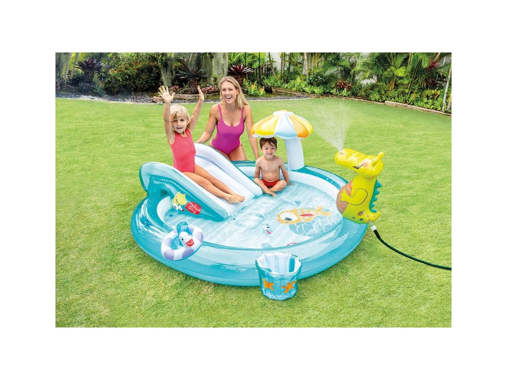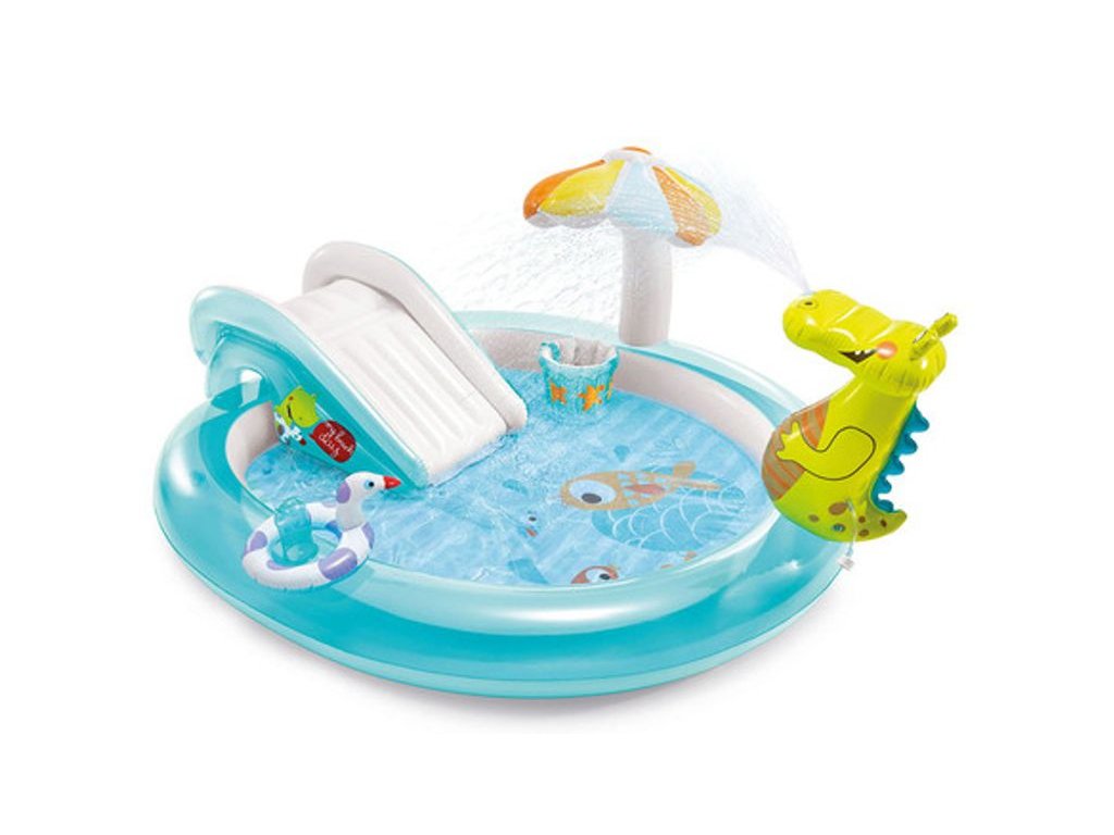 Užite si zábavné chvíle s bazénikom Intex® 57165 Gator play center ! Deti zažijú zábavu s krokodílom, šmýkačkou, nafukovacím vedierkom a plávacím kruhom. Približná veľkosť hracieho centra je 2,01 m x 1,70 m x 0,84m. Možnosť zapojenia záhradnej hadice a vytvoriť tak vodotrysky z bazéna pre ešte väčšiu zábavu vo vode. Hracie centrum je vybavené nafukovacou podlahou a vypúšťacím ventilom.