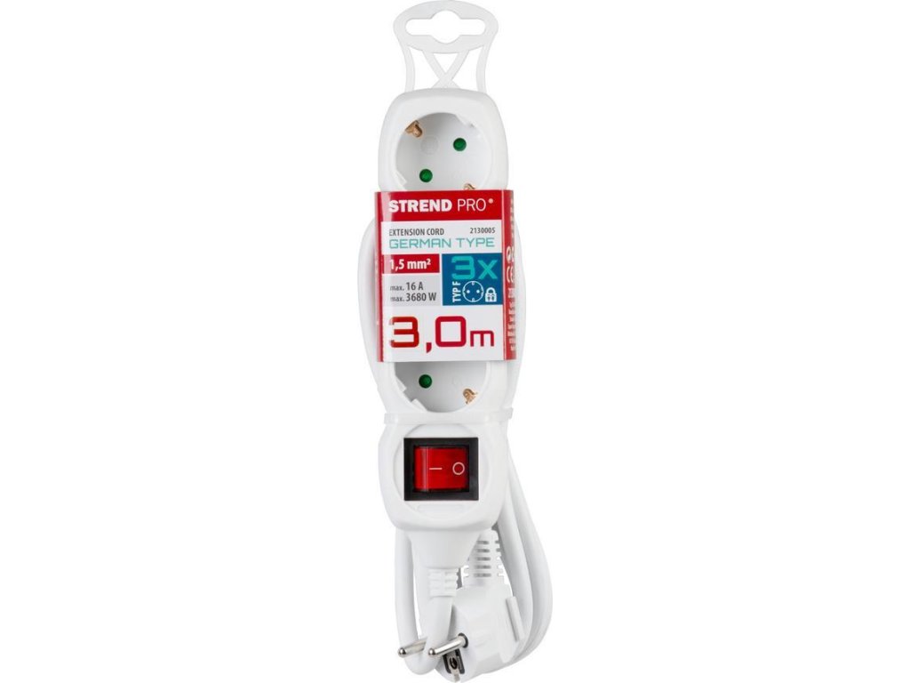 Predlžovací kábel Strend Pro DG-803B v klasickom bielom prevedení má dĺžku 3 metre. Kábel je učený pre krajiny s nemeckými zásuvkami typu F. Kábel má detskú poistku, takže sa nemusíte obávať pokiaľ mate malé deti. Do kábla môžete zapojiť 3 ľubovoľných spotrebičov.