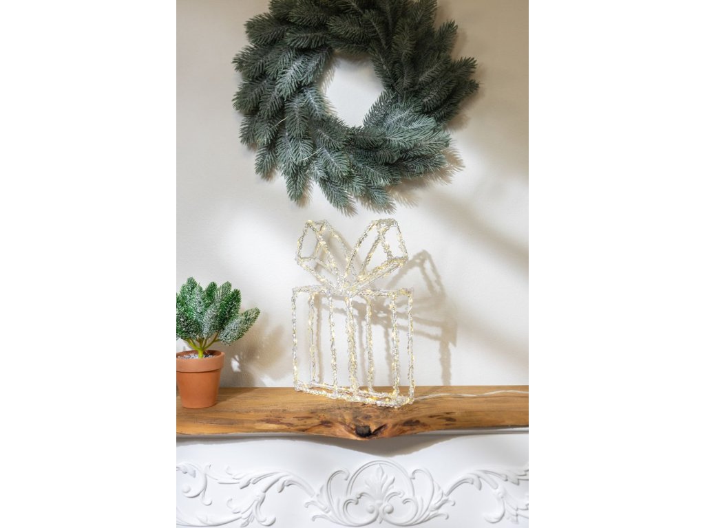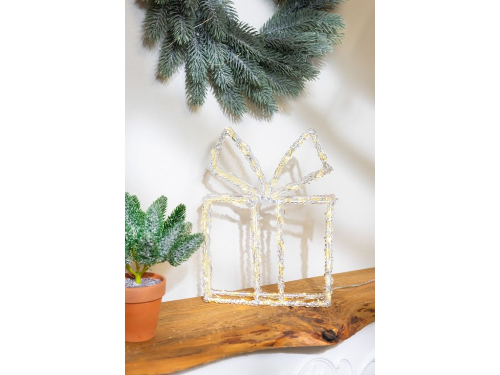 Dekorácia má rozmery 21x5x28 cm a svojím jedinečným dizajnom v tvare darčeka sa stane krásnym doplnkom v interiéri aj exteriéri. Napájanie zabezpečujú 2 batérie typu AA, vďaka čomu je možné dekoráciu umiestniť kdekoľvek bez nutnosti pripojenia do siete.