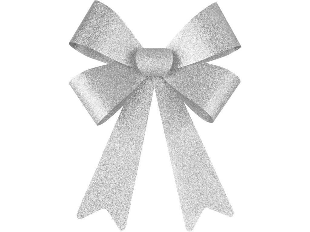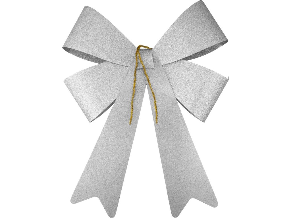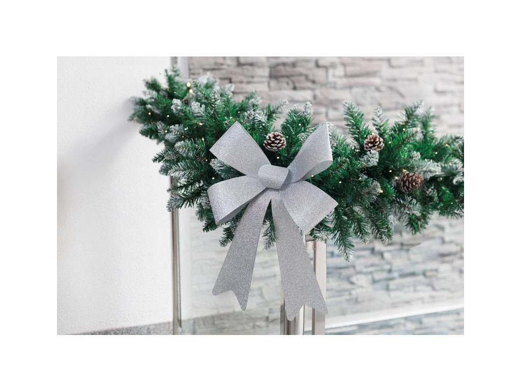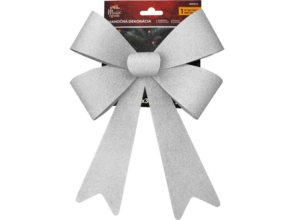 Dekorácia MagicHome Mašľa na vianočný veniec z trblietavého materiálu, ktorá rozžiari interiér vášho domu. Môže sa použiť aj na vianočnú girlandu. Farba mašle je strieborná a má rozmer 38 x 30 cm.