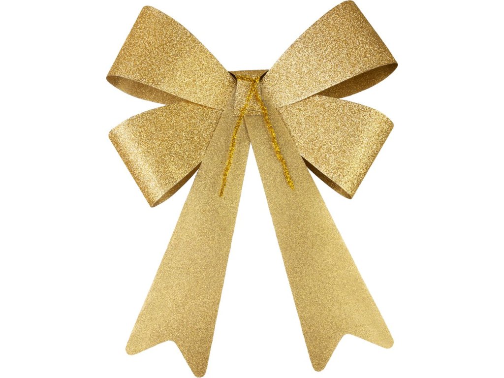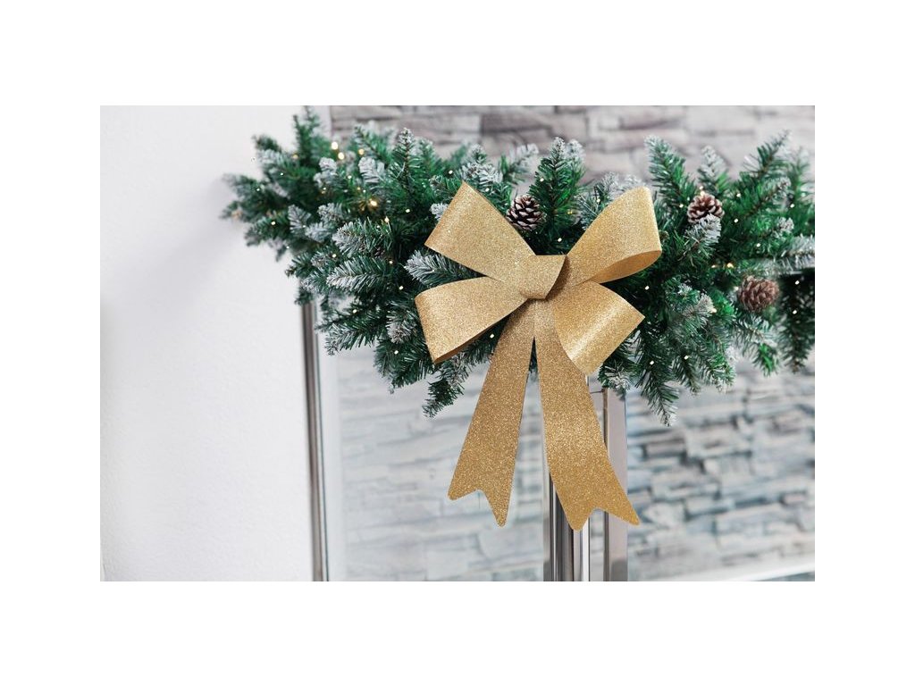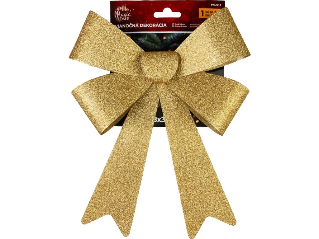Dekorácia MagicHome Mašľa na vianočný veniec z trblietavého materiálu, ktorá rozžiari interiér vášho domu. Môže sa použiť aj na vianočnú girlandu. Farba mašle je zlatá a má rozmer 38 x 30 cm.