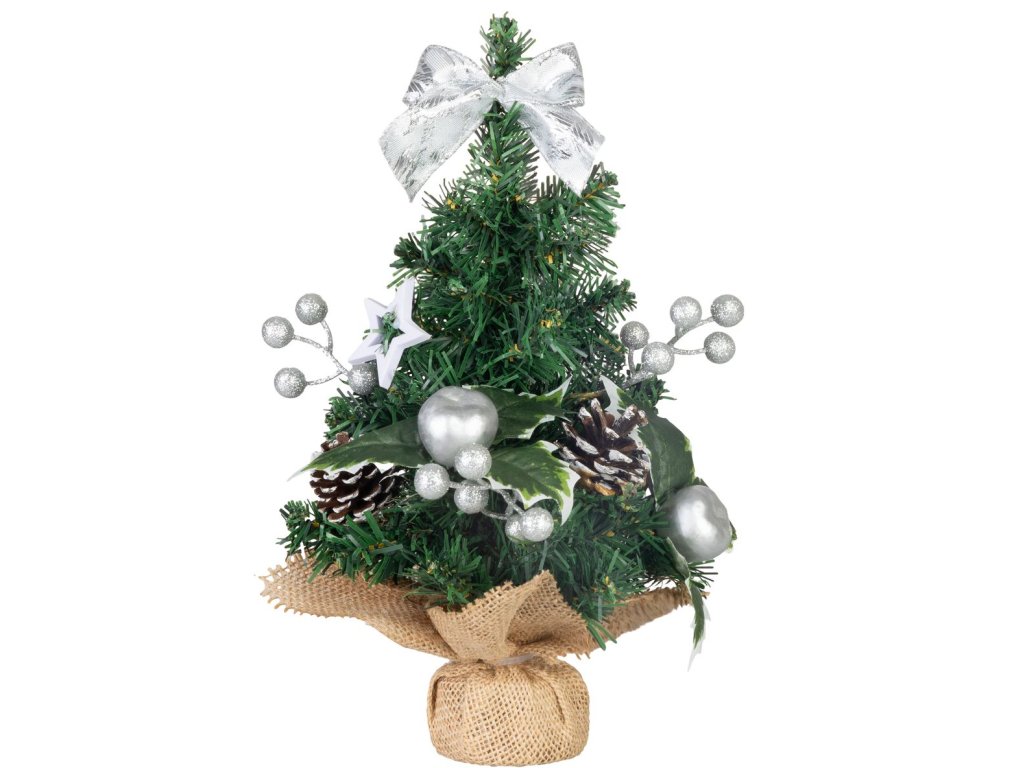 Dekorácia MagicHome Vianoce, stromček, 30 cm je štýlovým doplnkom, ktorý navodí sviatočnú atmosféru v každom interiéri. Malý vianočný stromček je zdobený striebornými ozdobami, šiškami a elegantnou mašľou, vďaka čomu pôsobí prirodzene a zároveň slávnostne. Jeho kompaktná veľkosť ho predurčuje na umiestnenie na stôl, policu alebo do okna, kde sa stane neprehliadnuteľným prvkom vašej výzdoby. Vďaka stabilnému podstavcu v jutovej úprave je stromček nielen praktický, ale aj estetický.