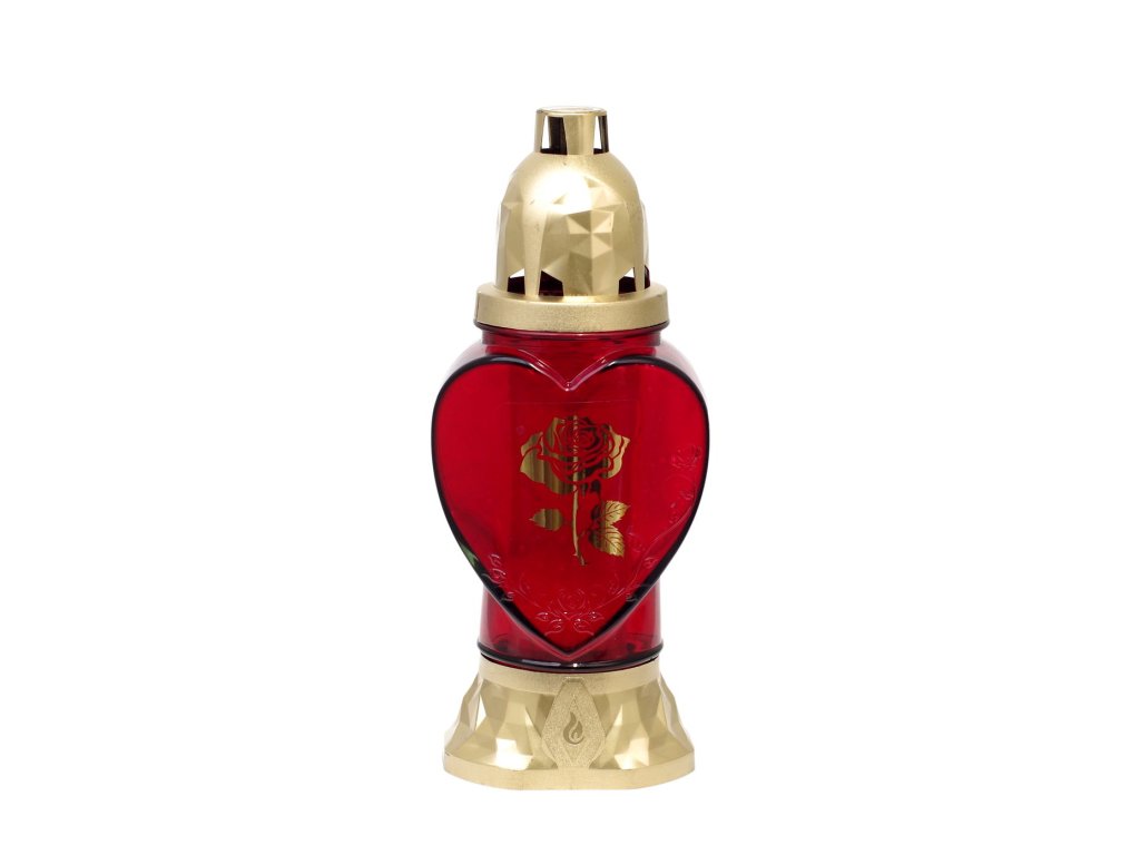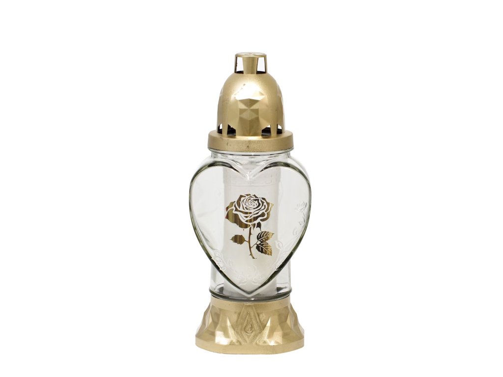 Dodajte miestu posledného odpočinku nežný dotyk úcty s elegantným kahancem Rose. Tento kahanec je vyrobený z kvalitného číreho dekoratívneho skla v tvare srdca s jemným embosovaným reliéfom a motívom ruže. Doplnený je o pozlatený plastový podstavec a kryt, ktoré podčiarkujú jeho decentný vzhľad.