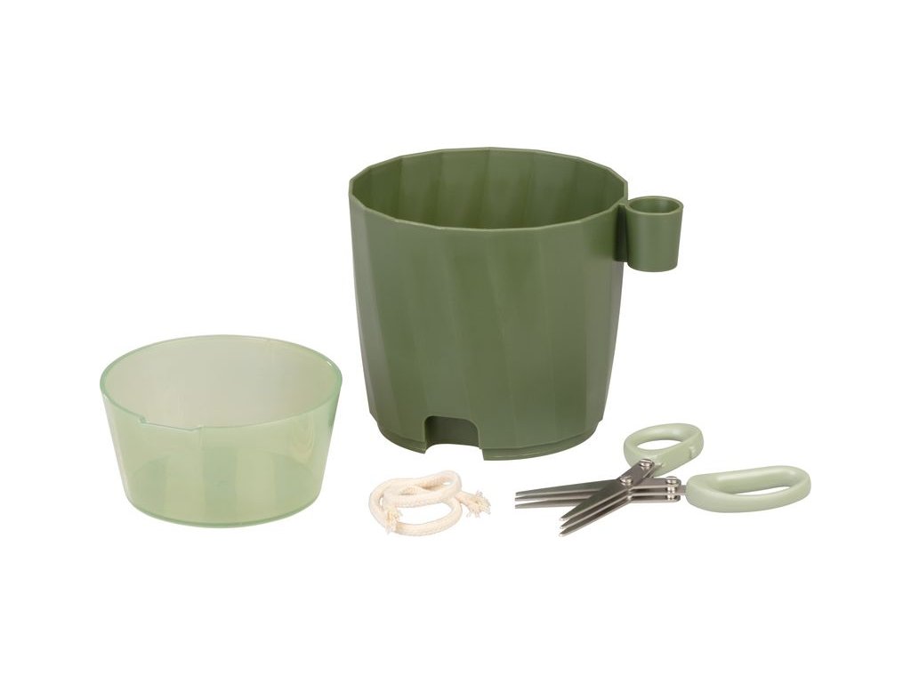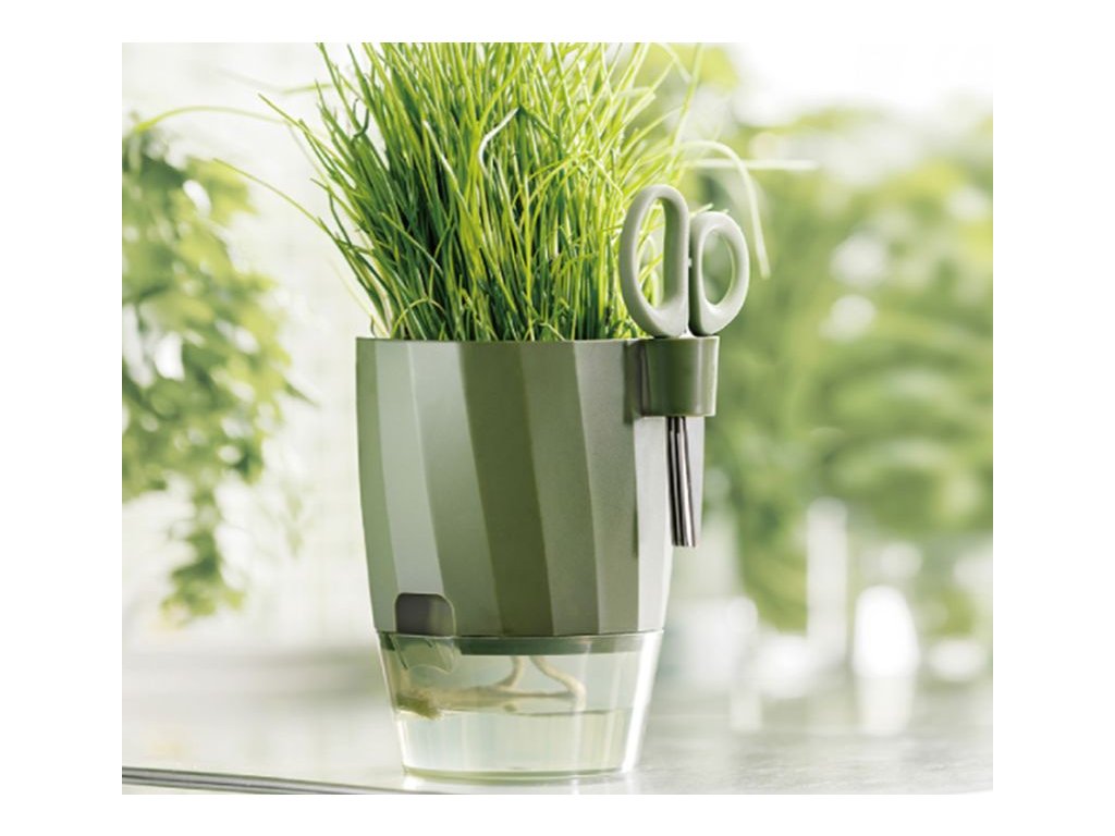 Vyrobený je zkvalitného plastu, ktorý je ľahký, odolný a ľahko sa čistí. Kvetináč obsahujeintegrovaný držiakna malézáhradnícke nožnice, ktoré sú súčasťou balenia a uľahčujú pravidelné zastrihávanie byliniek a rastlín priamo pri pestovaní.