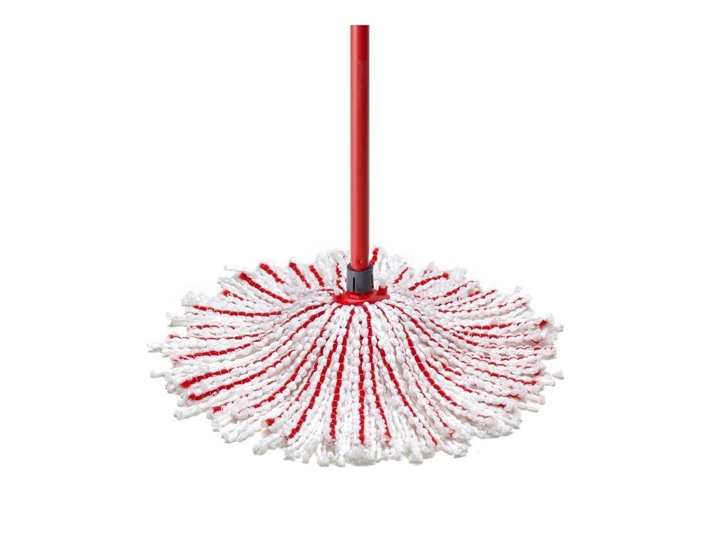 Inovatívna technológia kombinujúca biele strapce mikrovlákien so špeciálnymi červenými strapcami ponúka nový čistiaci výkon. Červené vlákna mopu pomáhajú zbierať chlpy a častice, zatiaľ čo biele strapce nasávajú tekutiny a odolné nečistoty. Mop možno použiť na všetky typy podláh, ako sú parkety, dlaždice alebo vinylové či drevené podlahy.