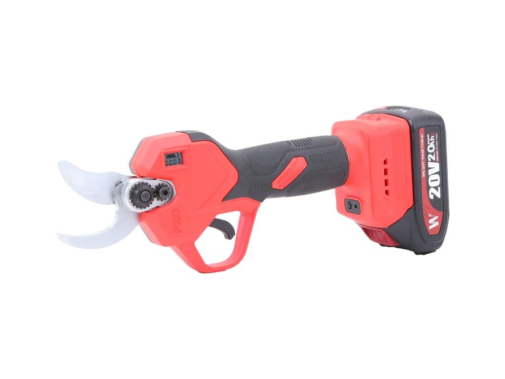 Tento model je dodávaný ako kompletný SET v kufri, takže po vybalení môžeš hneď pracovať – súčasťou balenia je 1× 2.0Ah batéria a 1× 1.0A nabíjačka. Maximálny priemer rezu je až 30 mm, s možnosťou voľby medzi dvomi rozsahmi 20 mm / 30 mm podľa typu a hrúbky vetvičiek.