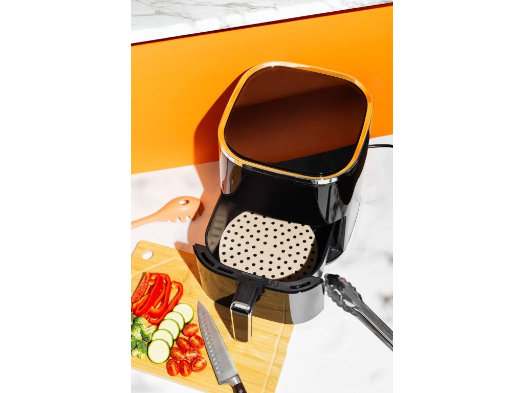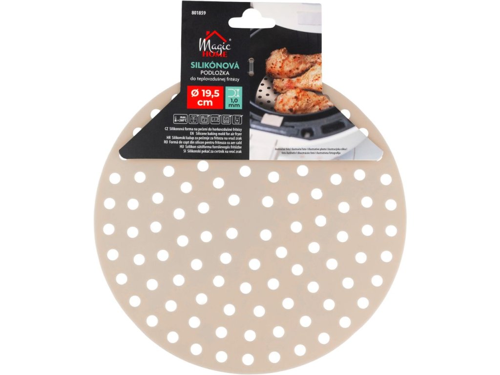 - Tvar a rozmery: Okrúhly tvar s rozmermi 19,5x5x0,1 cm je navrhnutý tak, aby perfektne pasoval do väčšiny štandardných fritéz.