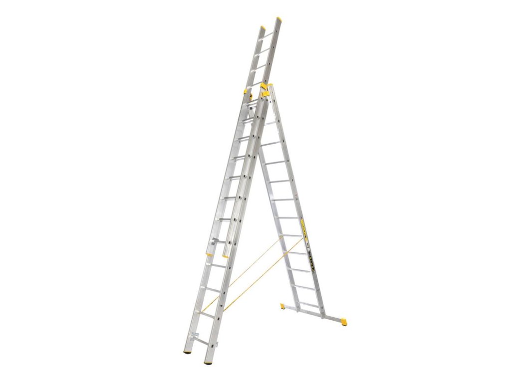 Trojdielny jednoduchý rebrík, čo znamená,že druhý diel sa môže z prvého vysúvať pri zloženom aj roztvorenom stave.Vďaka tretiemu dielu môžete rebrík prakticky oprieť,pokiaľ vás pustí popruh medzi dielmi rebríka a získať tak väčšiu stabilitu.