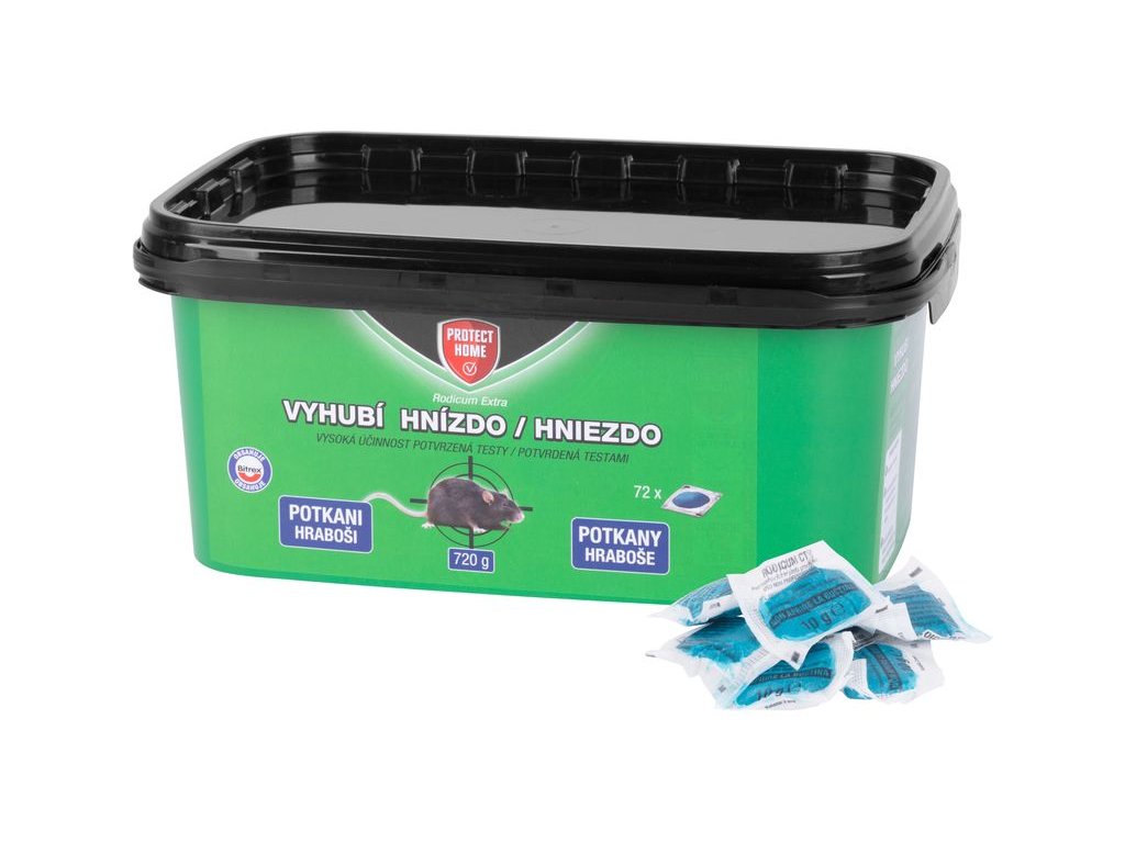 Mäkká návnada na myši Rodicum Extra - rodenticíd určený pre hubenie potkanov a myší vnútri a okolo budov, hrabošov a hrdziakov okolo budov. Účinná látka: Kumatetralyl 0,0027% Kumatetryl brzdí proces zrážania krvi a behom 3-4 dní dochádza k bezbolestnej smrti zvieraťa v dôsledku vnútorného krvácania, zastavuje syntézu promotrobinu v pečeni a v prípade zranenia zabraňuje zrážanlivosti krvi, zastavuje pôsobenie vitamínu K, ktorý má dôležitú rolu v procese zrážania krvi - vysoká účinnosť potvrdená testami - vysoká odolnosť nástrahy proti vlhkosti - obsahuje Bitrex, ochranu pred náhodným požitím necieľovými živočíchmi.