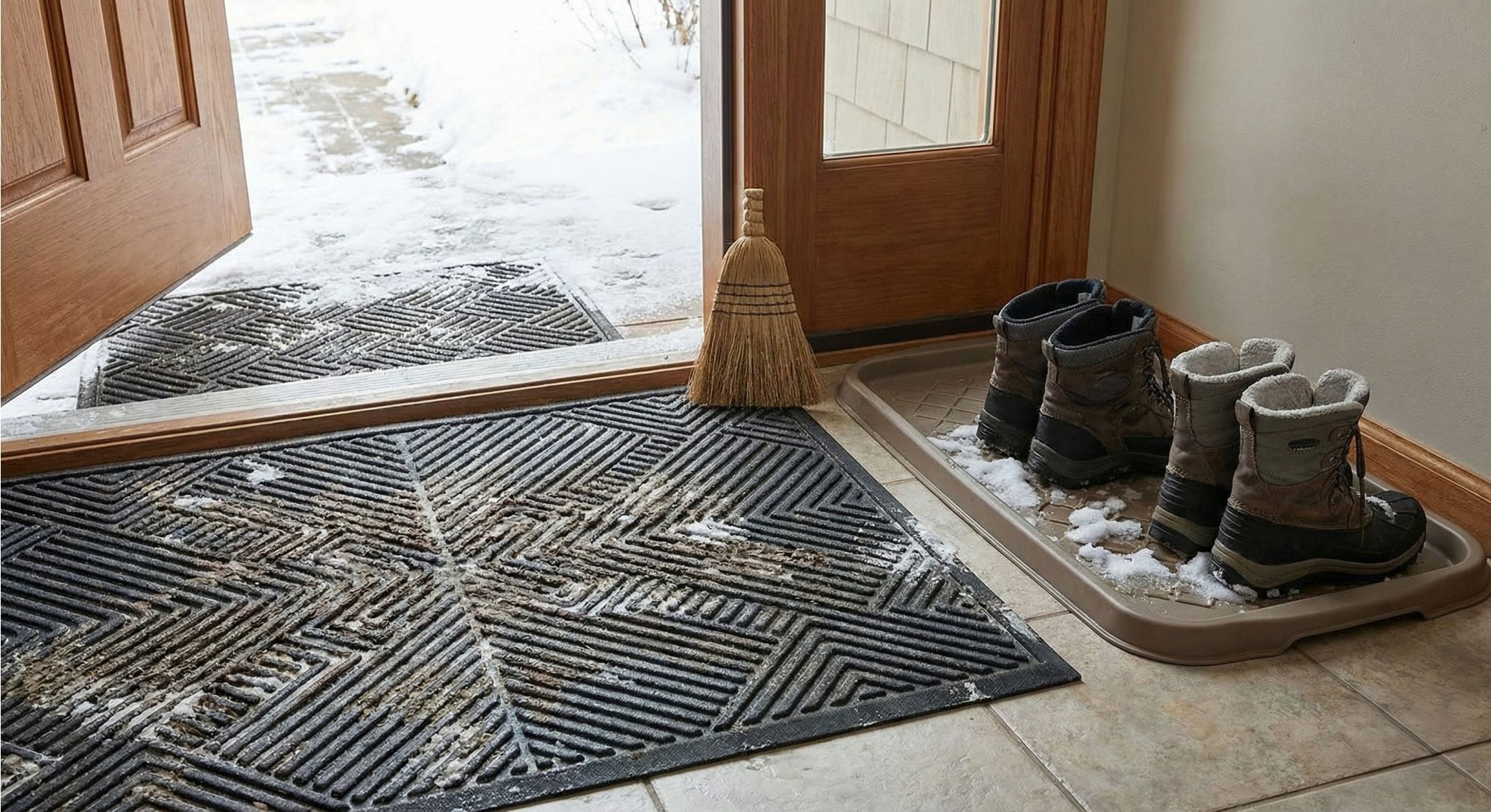 - Kvalitnú gumovú vstupnú rohožku s výrazným vzorom, ktorá "zoškrabe" hrubé blato a sneh z podrážok.