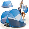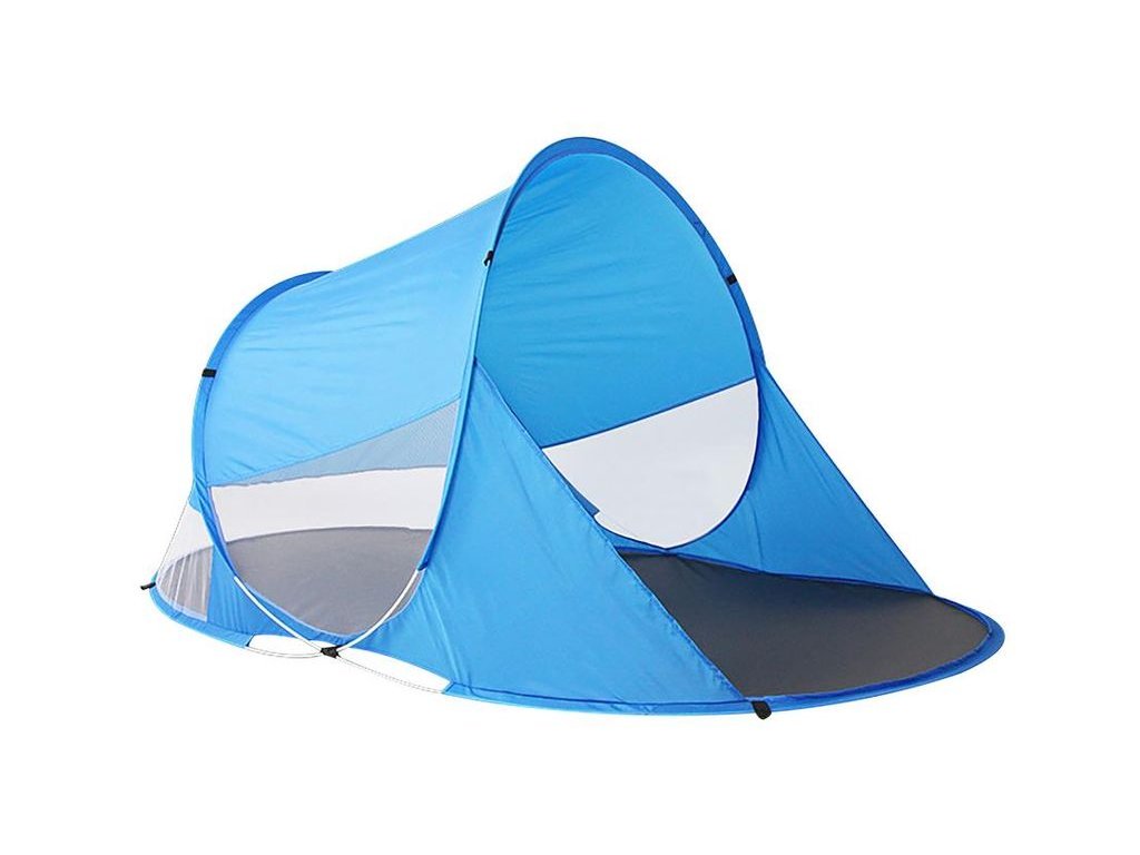 Plážový modrý stan je vhodný pre dospelých aj deti. Nemá prednú plachtu, ktorou sa dá úplne zatvoriť. Vaše deti sa tak môžu hrať v stane a pritom ich budete mať stále na očiach. Stan je vyrobený z polyesteru odolného voči UV žiareniu a vode. Stan si udržiava pevnú konštrukciu pomocou častí spevnených sklolaminátom. Rozmery sú 190 x 120 x 90 cm.