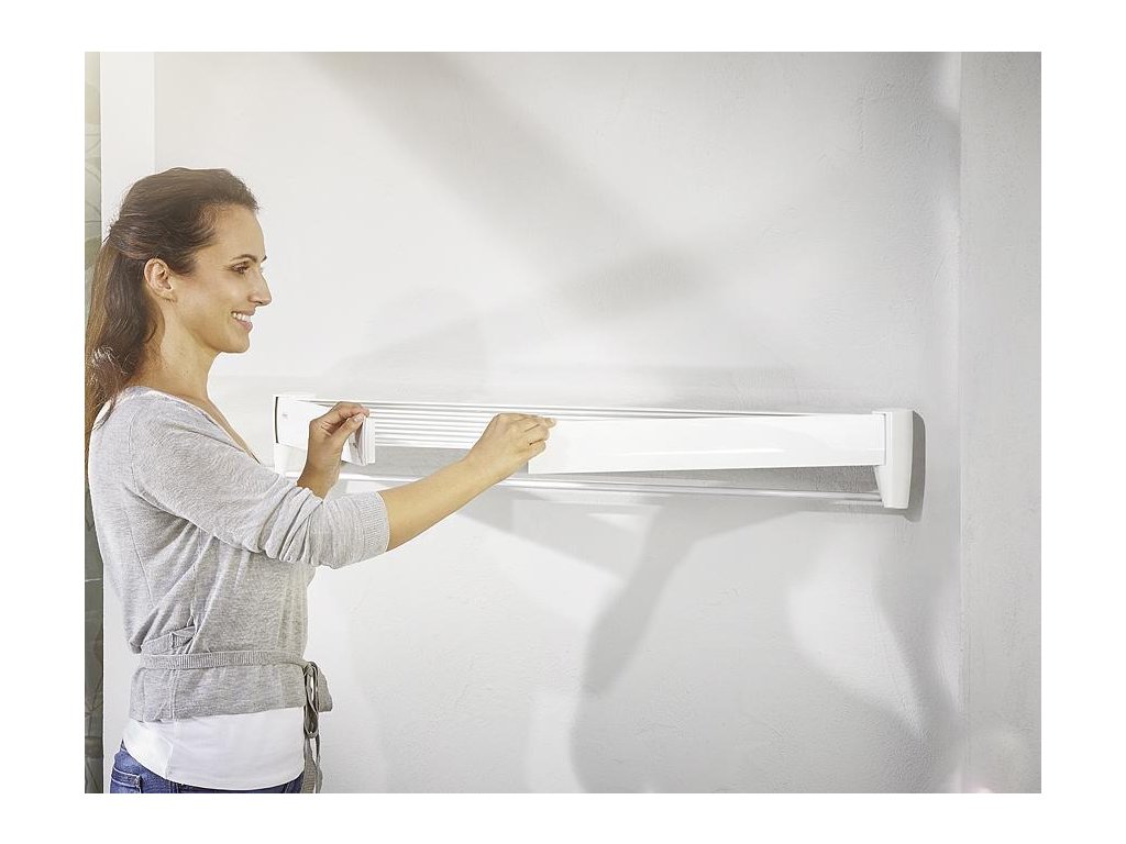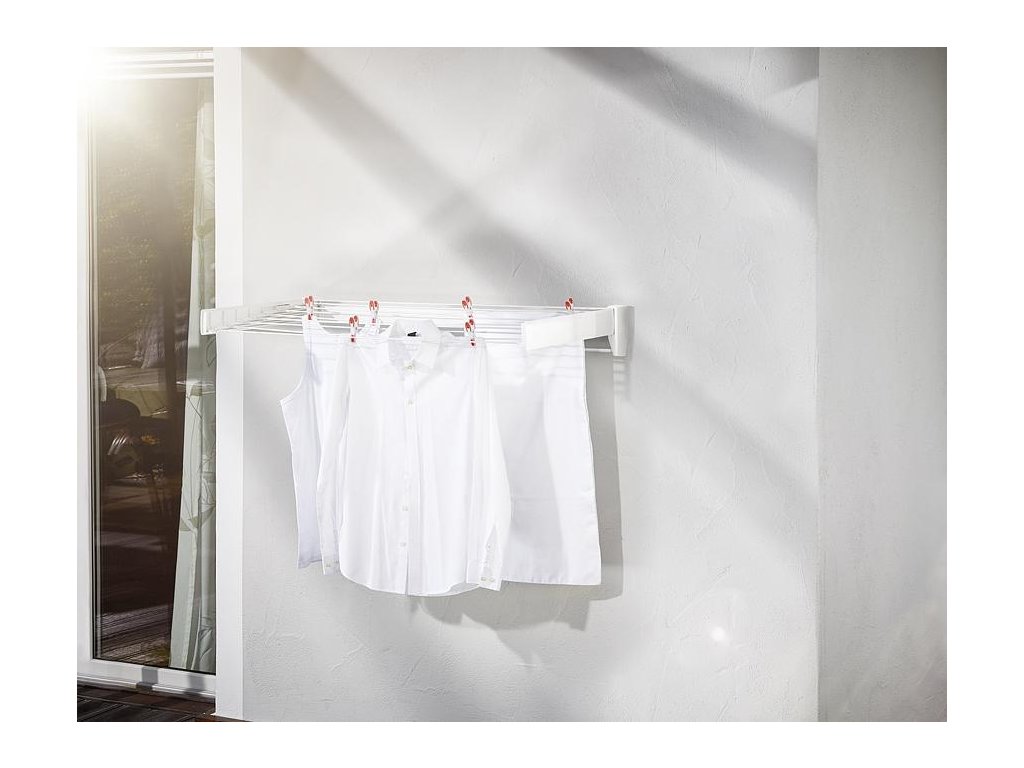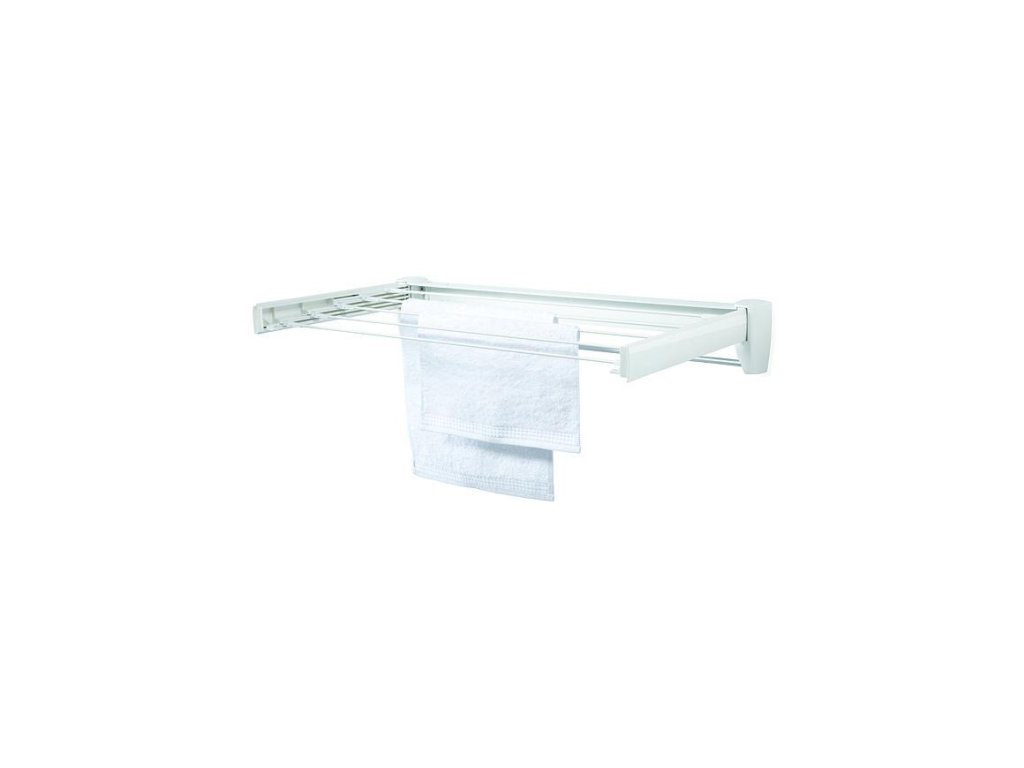 Praktický skladací nástenný sušiak na bielizeň, šetrí miesto, vhodný nielen do kúpeľne, samostatný chrómovaný vešiak na osušky, šírka tyčí 70 cm, 3,6 m sušiacej plochy, záruka 3 roky.