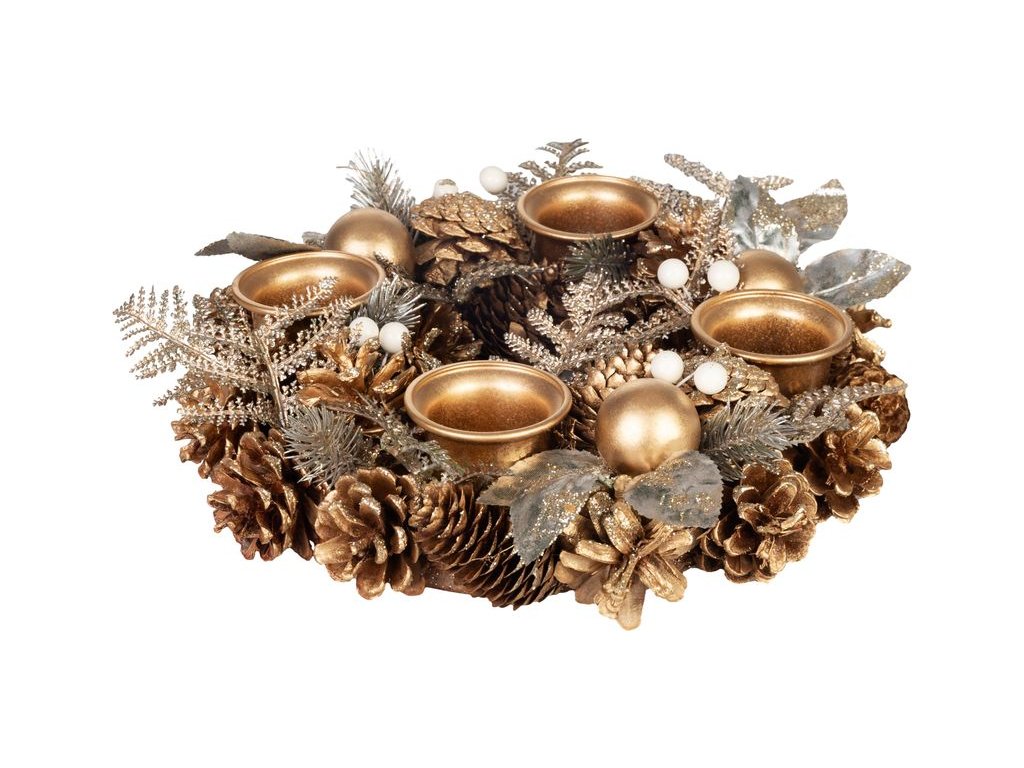 Doprajte si dokonalú vianočnú atmosféru s elegantným adventným vencom MagicHome. Je vyrobený v luxusnej zlatej farbe a zdobený prírodnými šiškami, dekoratívnymi guľôčkami a listami, ktoré dodávajú sviatočnému obdobiu štýlový lesk. Štyri svietniky na sviečky poskytujú ideálne rozdelenie pre zapálenie adventných sviec počas štyroch týždňov pred Vianocami.