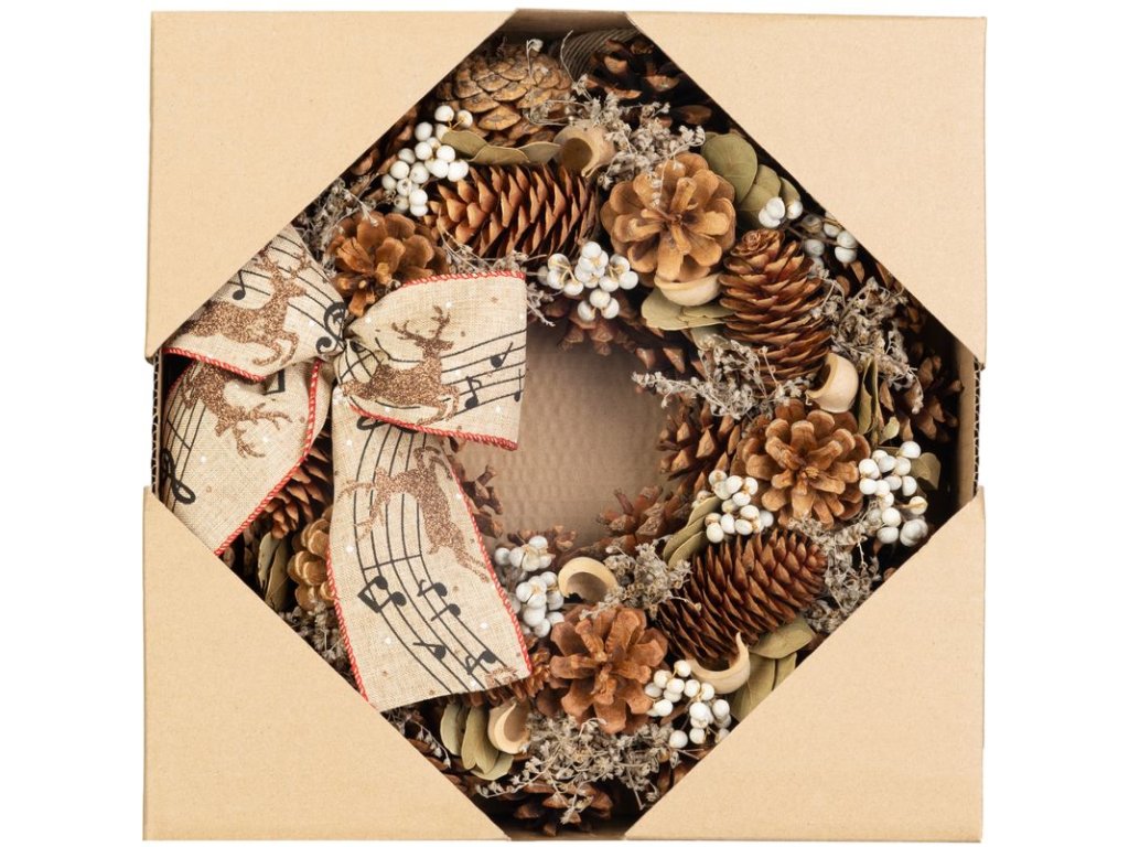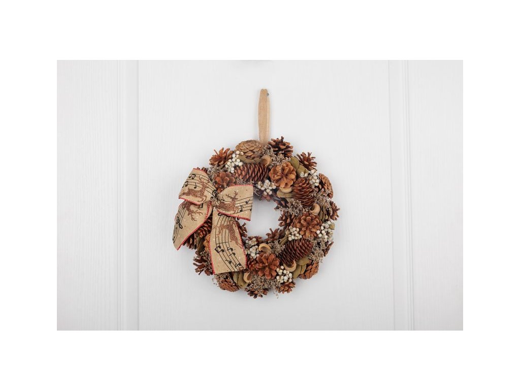 Dekor je doplnený ozdobnou mašľou s hudobným motívom, ktorá dodáva vencu originálny a tradičný vzhľad. Veniec má praktické pútko na zavesenie, takže ho jednoducho umiestnite na dvere, stenu alebo okno.