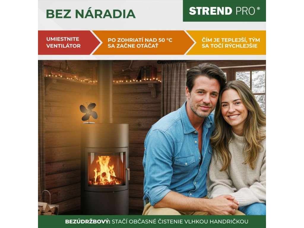 Ventilátor Strend Pro, krbový, stojanový, poháňaný teplom, 4-lopatkový, čierny
