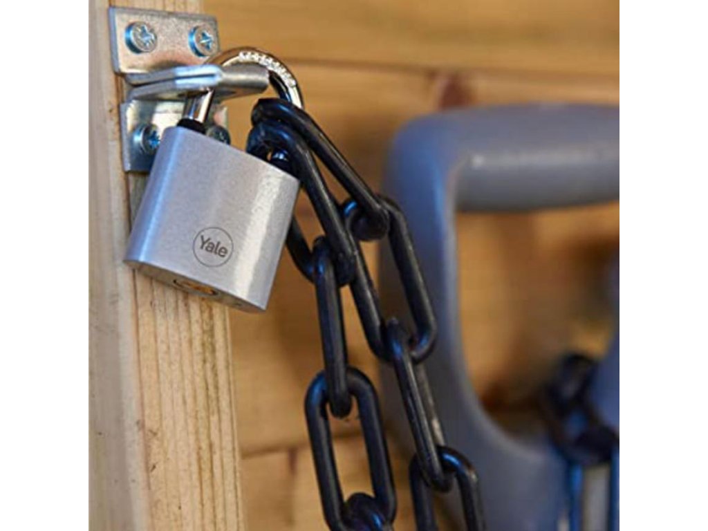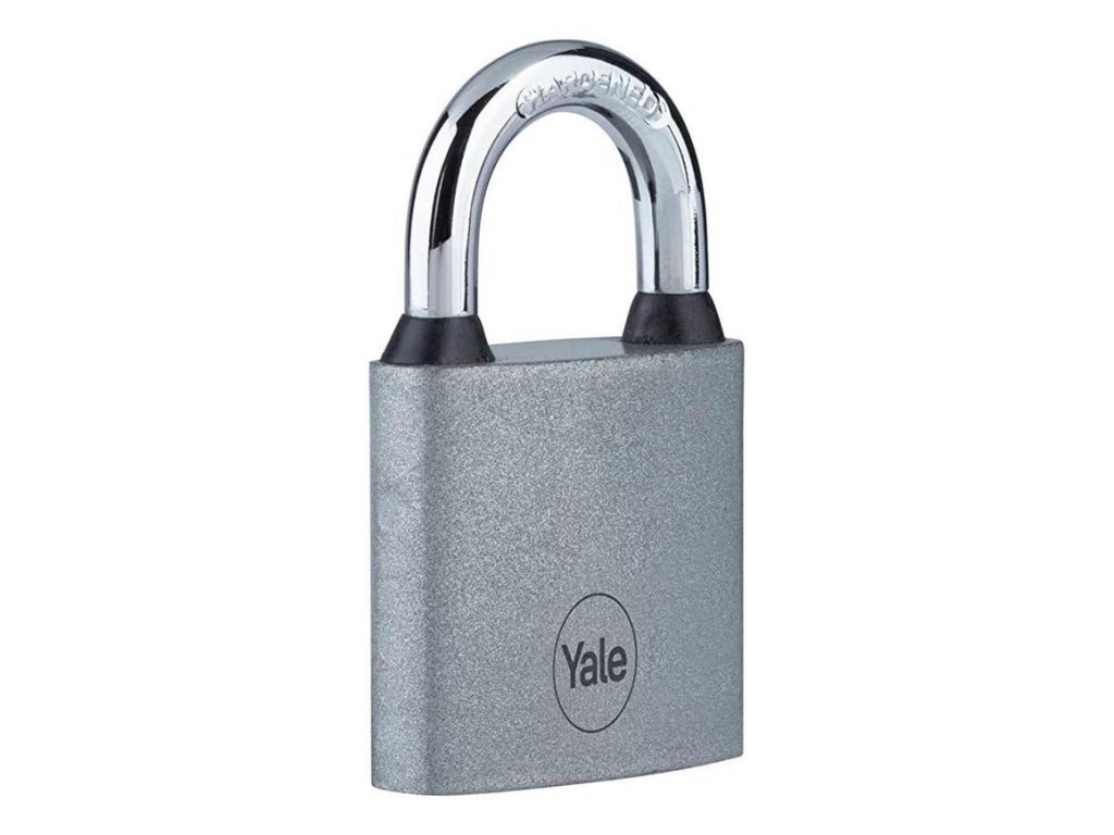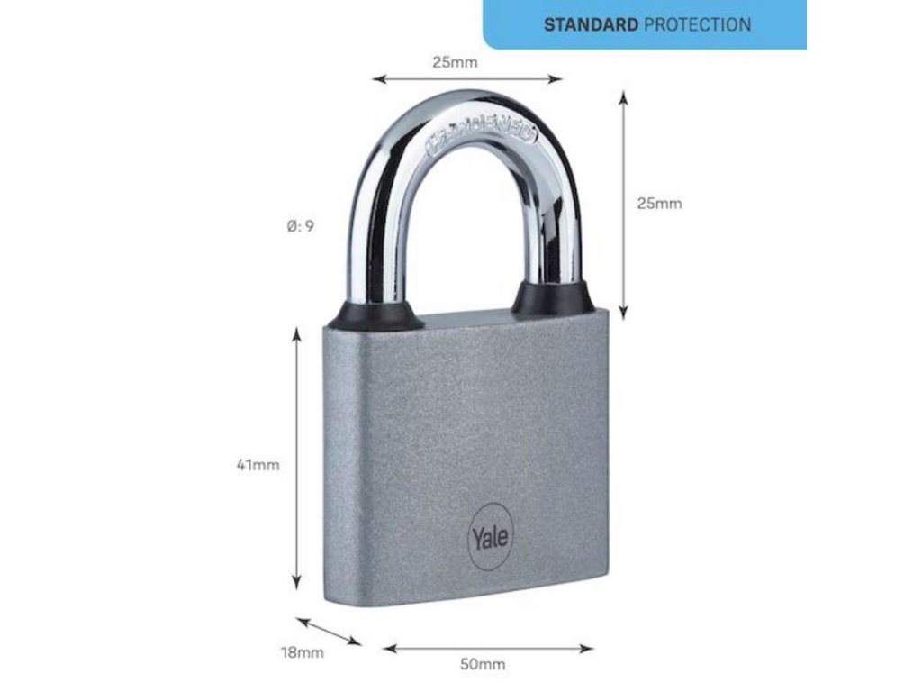 Visiaci zámok Yale so šírkou 50 mm so štandardnou úrovňou zabezpečenia. Železná konštrukcia disponuje tvrdeným strmeňom, ktorý zabraňuje prerezaniu. Odolný zámok testovaný na 10 000 cyklov (otvorenie a zatvorenie) pre optimálny výkon. Balenie obsahuje 3 ks kľúčov.