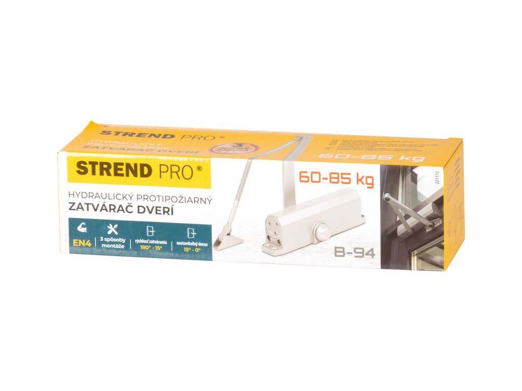 Strend Pro B-94 je spoľahlivý hydraulický zatvárač dverí určený pre hmotnosť dverí v rozmedzí 60 až 85 kg. Vďaka odolnej konštrukcii a protipožiarnej certifikácii je ideálnou voľbou pre interiérové aj exteriérové aplikácie – doma, v kanceláriách či verejných budovách.